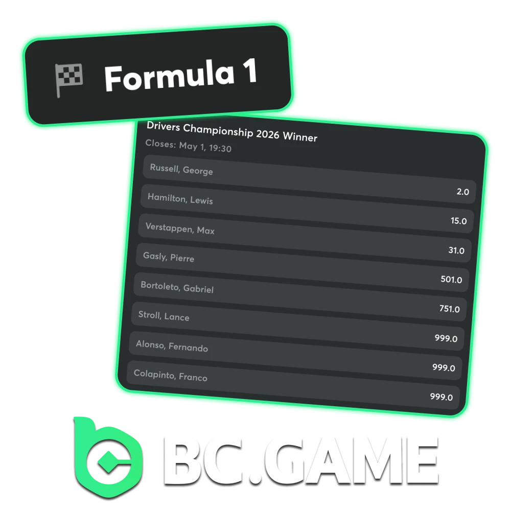 - Competitive F1 odds. BC Game formula 1 odds are structured to offer strong value across major markets, especially on race winner and championship outright bets;